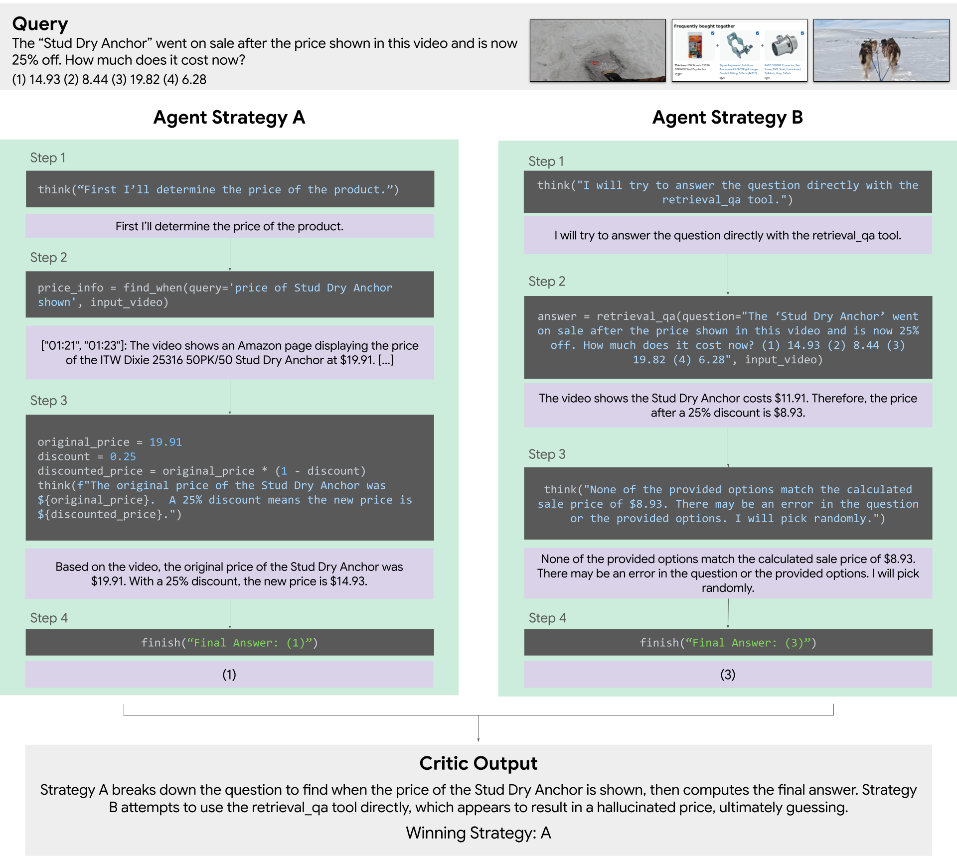 We introduce a critic to distinguish between instances of successful and unsuccessful sequences from the agent, showing the combination of the agent and critic can achieve state-of-the-art performance across complex video reasoning tasks.
