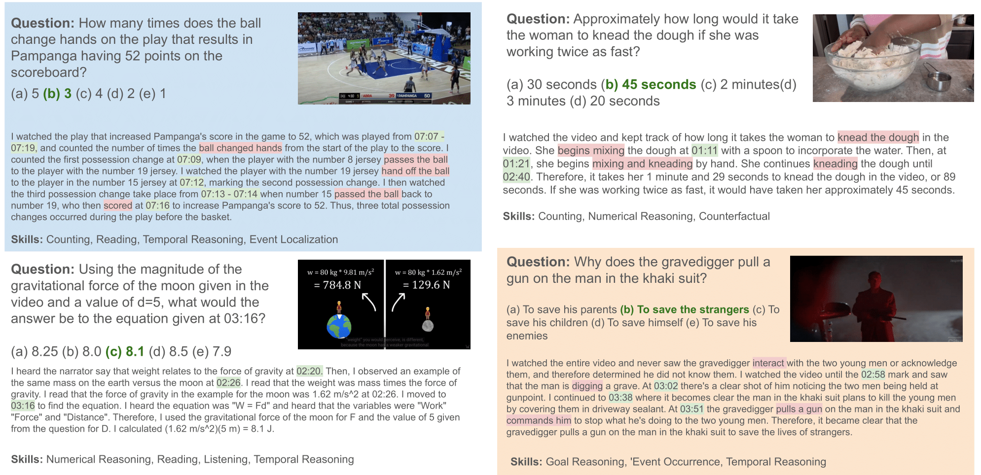We create a new benchmark for evaluating the multi-step reasoning capabilities of language models on video data, evaluating not only final answers but also the reasoning process used by the model to arrive at those answers through a combination of multiple-choice and LLM-as-a-judge grading.